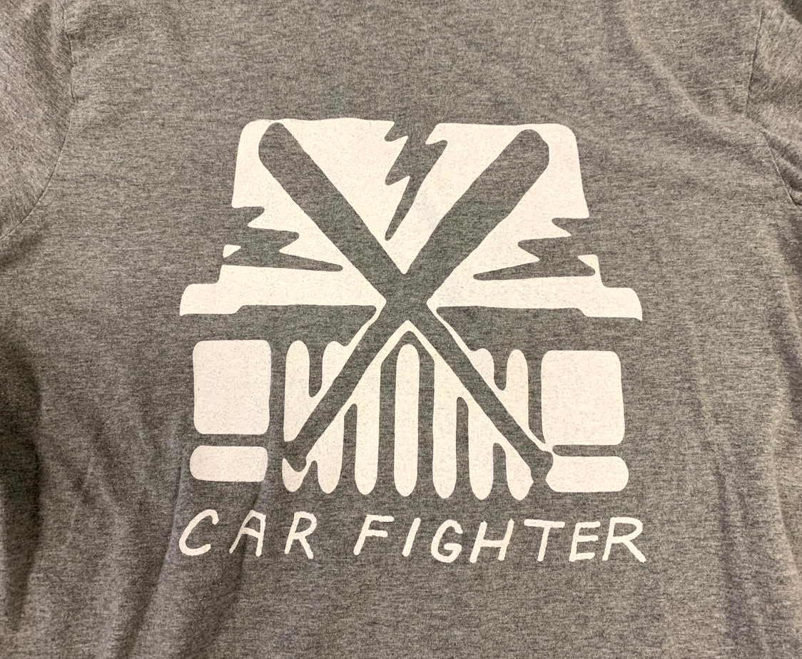 Bring out the Car Fighter within! Carfighter Logo printed in white on dark heather grey, thrifted, long-sleeve tee. Size: Medium Each shirt is unique.