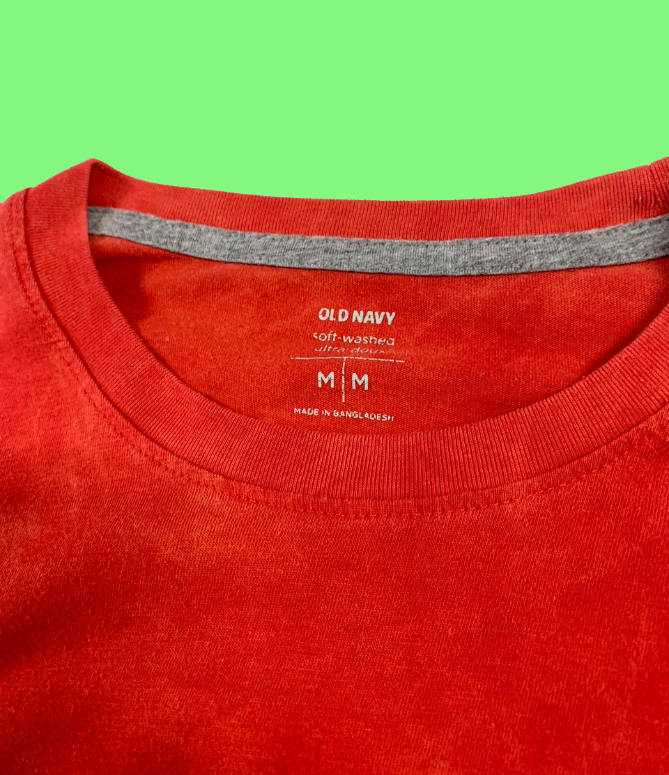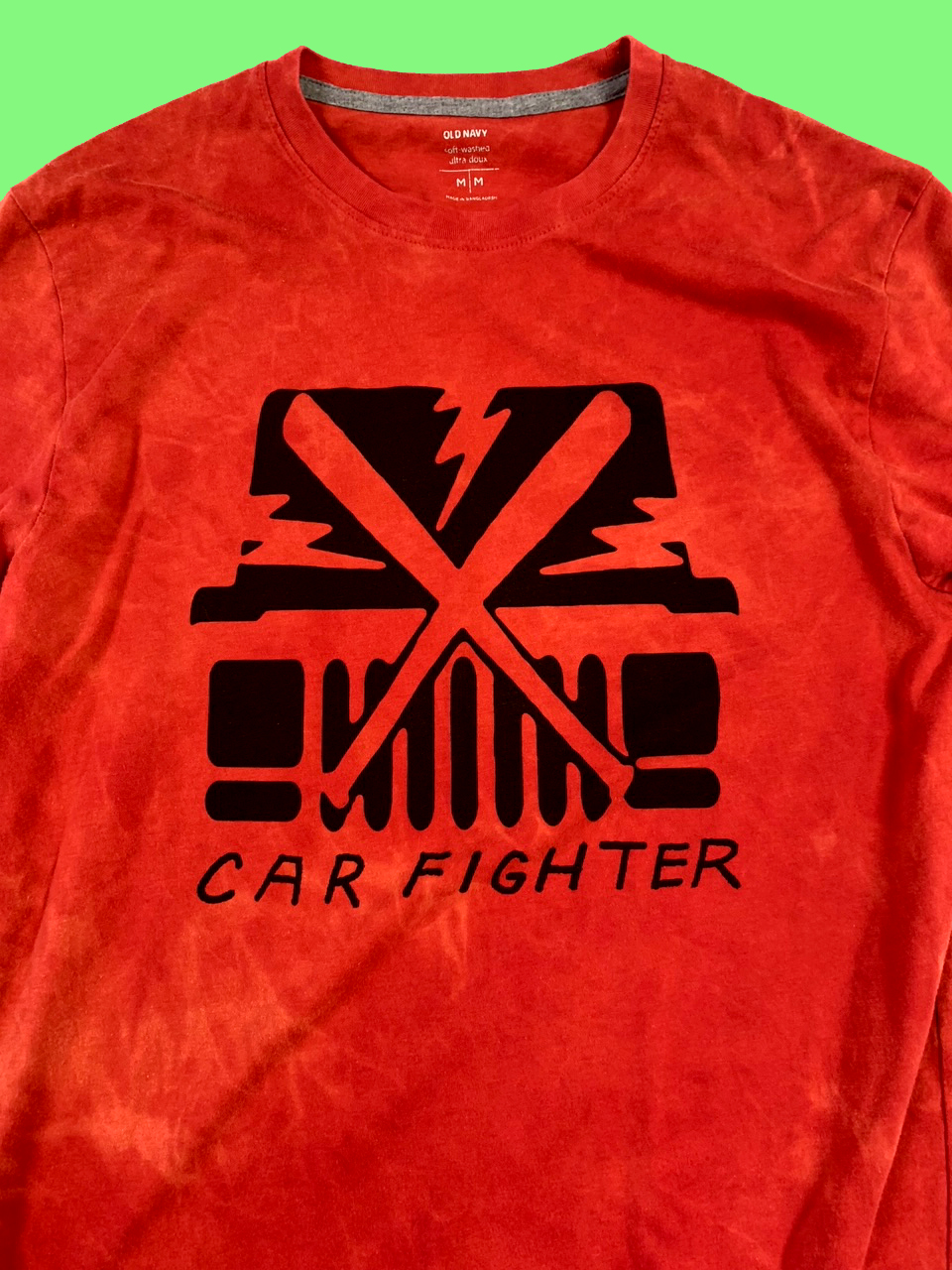 Carfighter Logo printed in black on red, bleach-dyed, thrifted, long-sleeve tee. Size: Medium