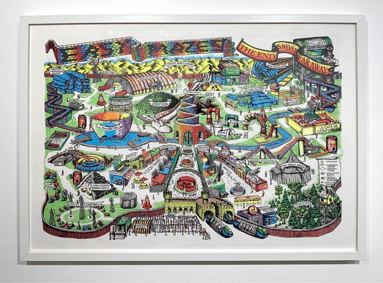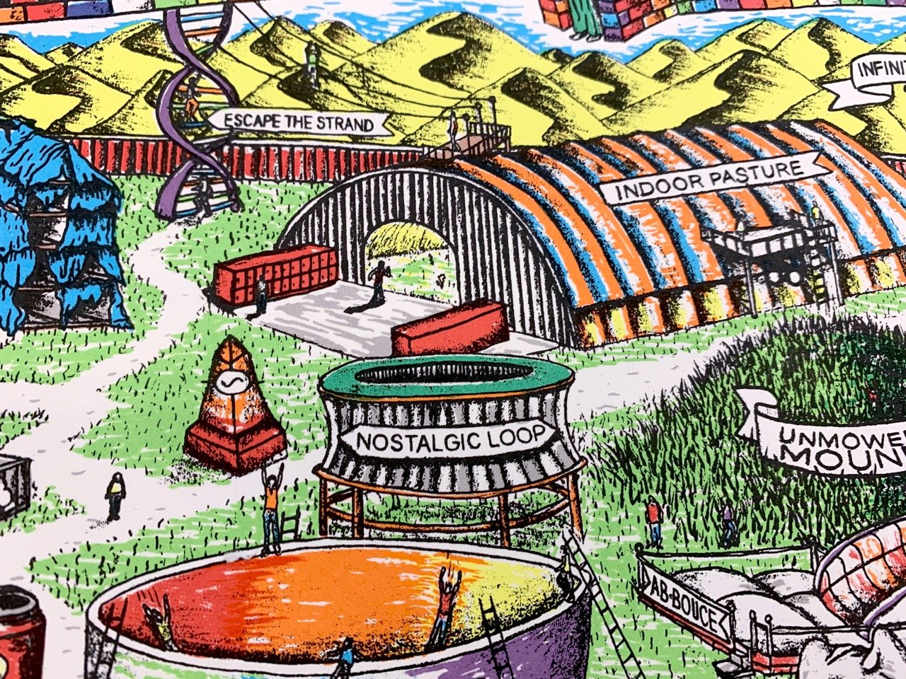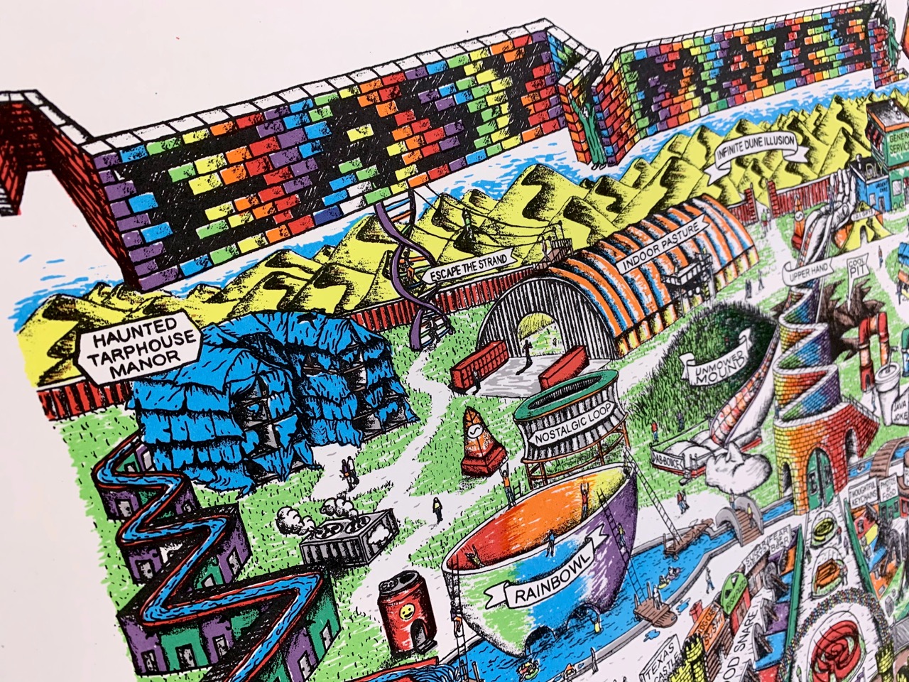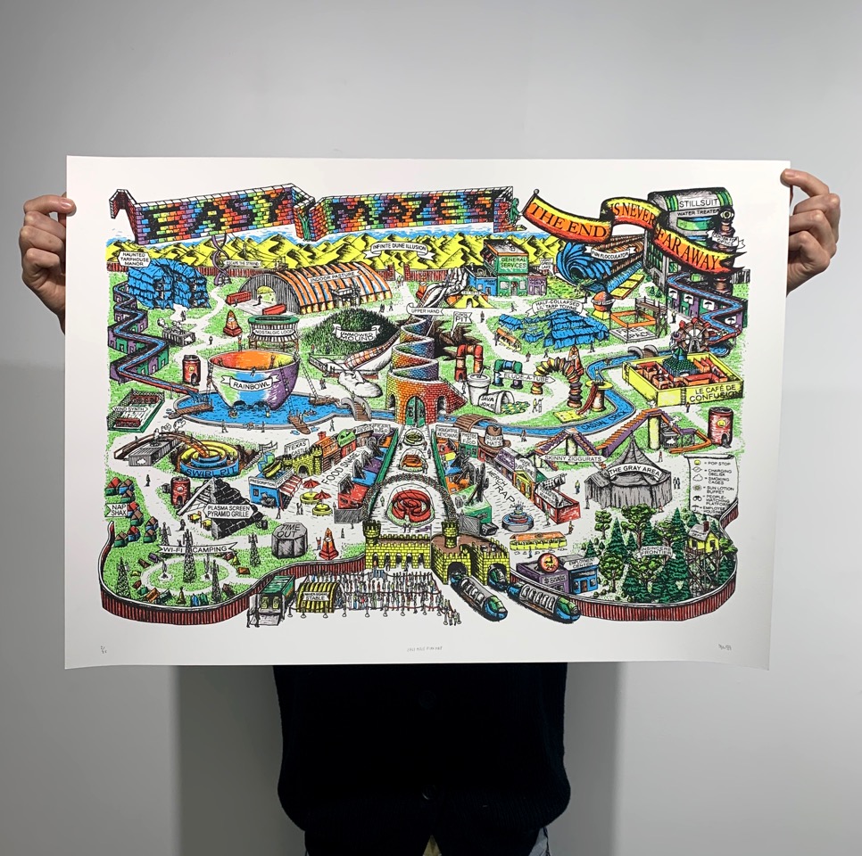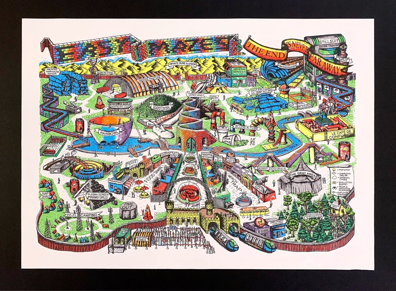 Future plans for a homemade theme park...(Ground-breaking for this project is currently on hold indefinitely due to lack of building permits, land, zoning, insurance, funding, time, staff, etc.) The Easy Maze Fun Map is a limited-edition 11-color silkscreen print that spans 27.5" x 19.75," fitting perfectly in an affordable RIBBA frame from Ikea. The design is created from hand-drawn stencils and printed by the artist in an edition of 25. Each print is signed and numbered on the front. Ships in a tube. -----------------------------This one has been a long time coming, folks...Thanks for looking. :)
