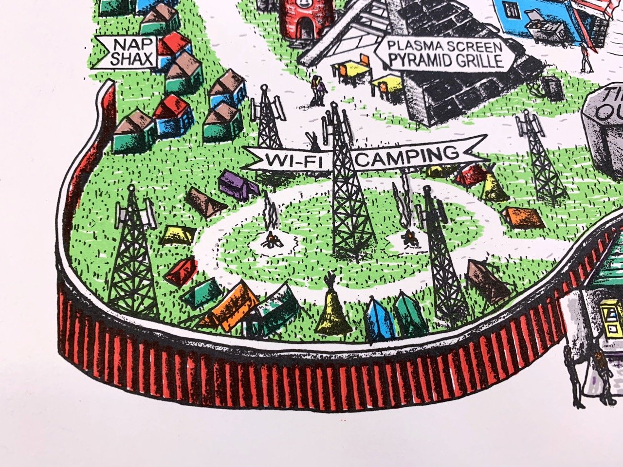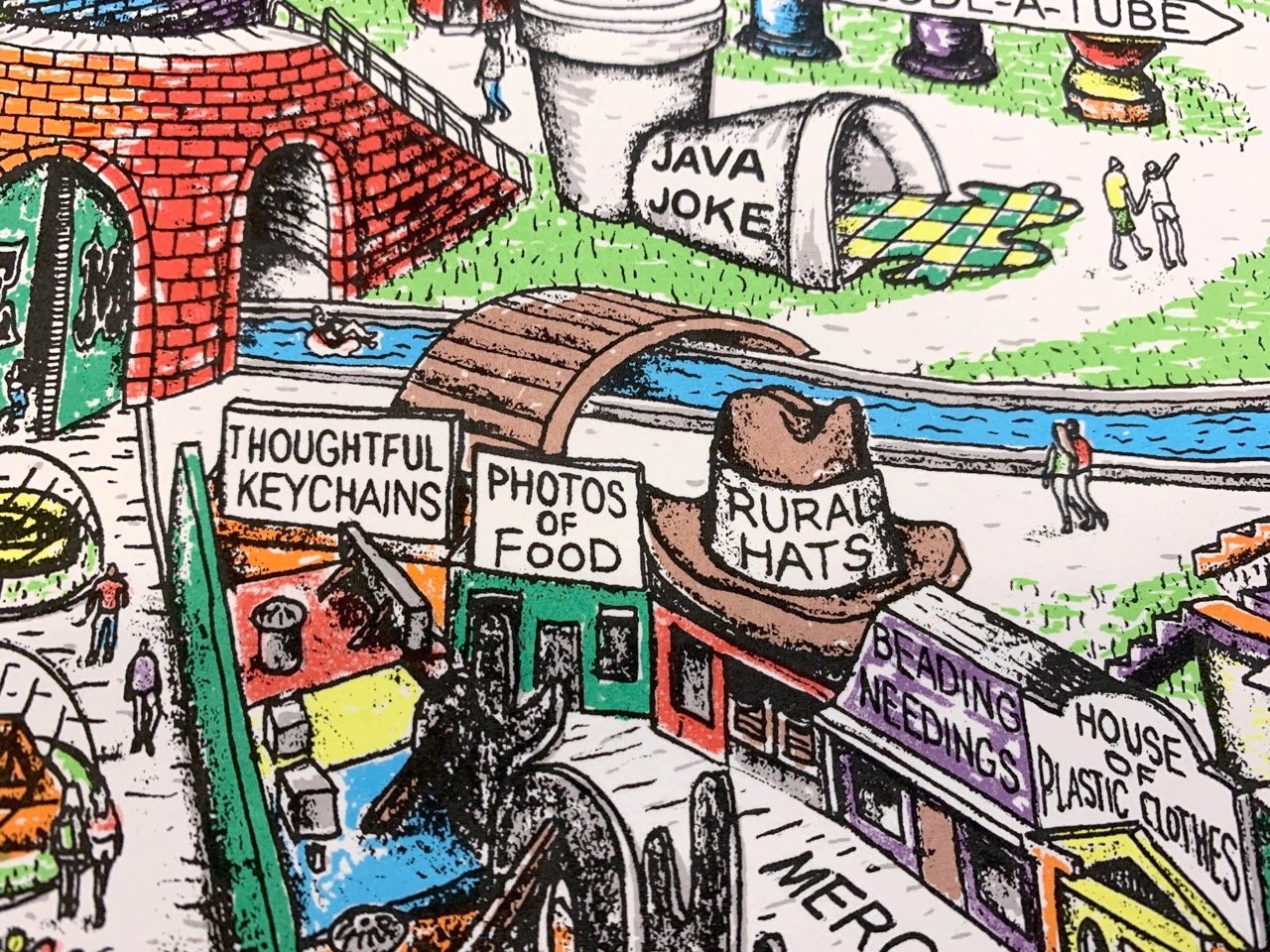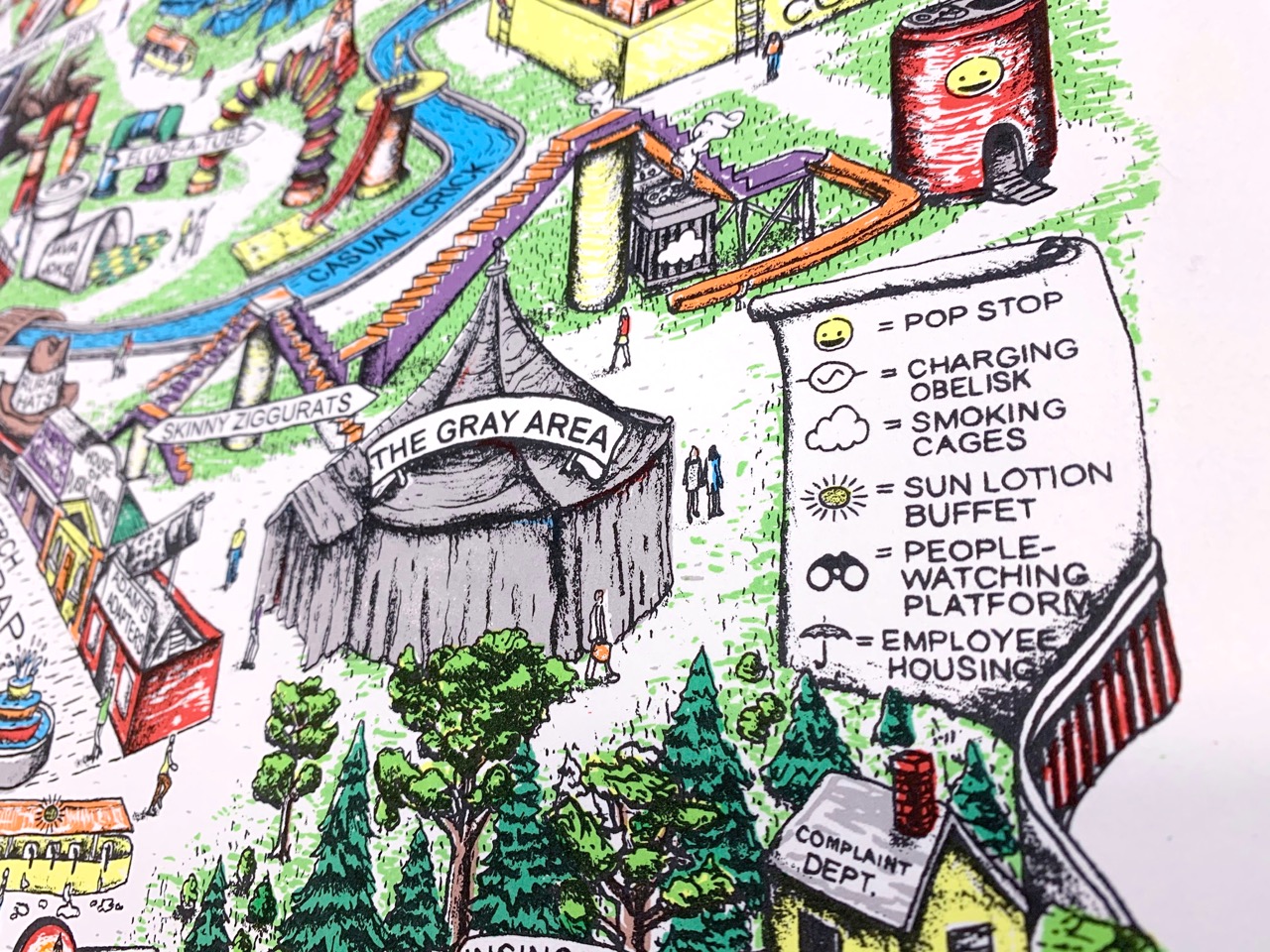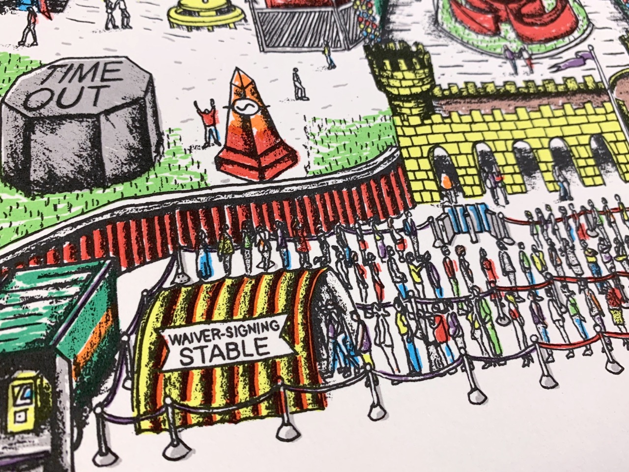 Future plans for a homemade theme park...(Ground-breaking for this project is currently on hold indefinitely due to lack of building permits, land, zoning, insurance, funding, time, staff, etc.) The Easy Maze Fun Map is a limited-edition 11-color silkscreen print that spans 27.5" x 19.75," fitting perfectly in an affordable RIBBA frame from Ikea. The design is created from hand-drawn stencils and printed by the artist in an edition of 25. Each print is signed and numbered on the front. Ships in a tube. -----------------------------This one has been a long time coming, folks...Thanks for looking. :)