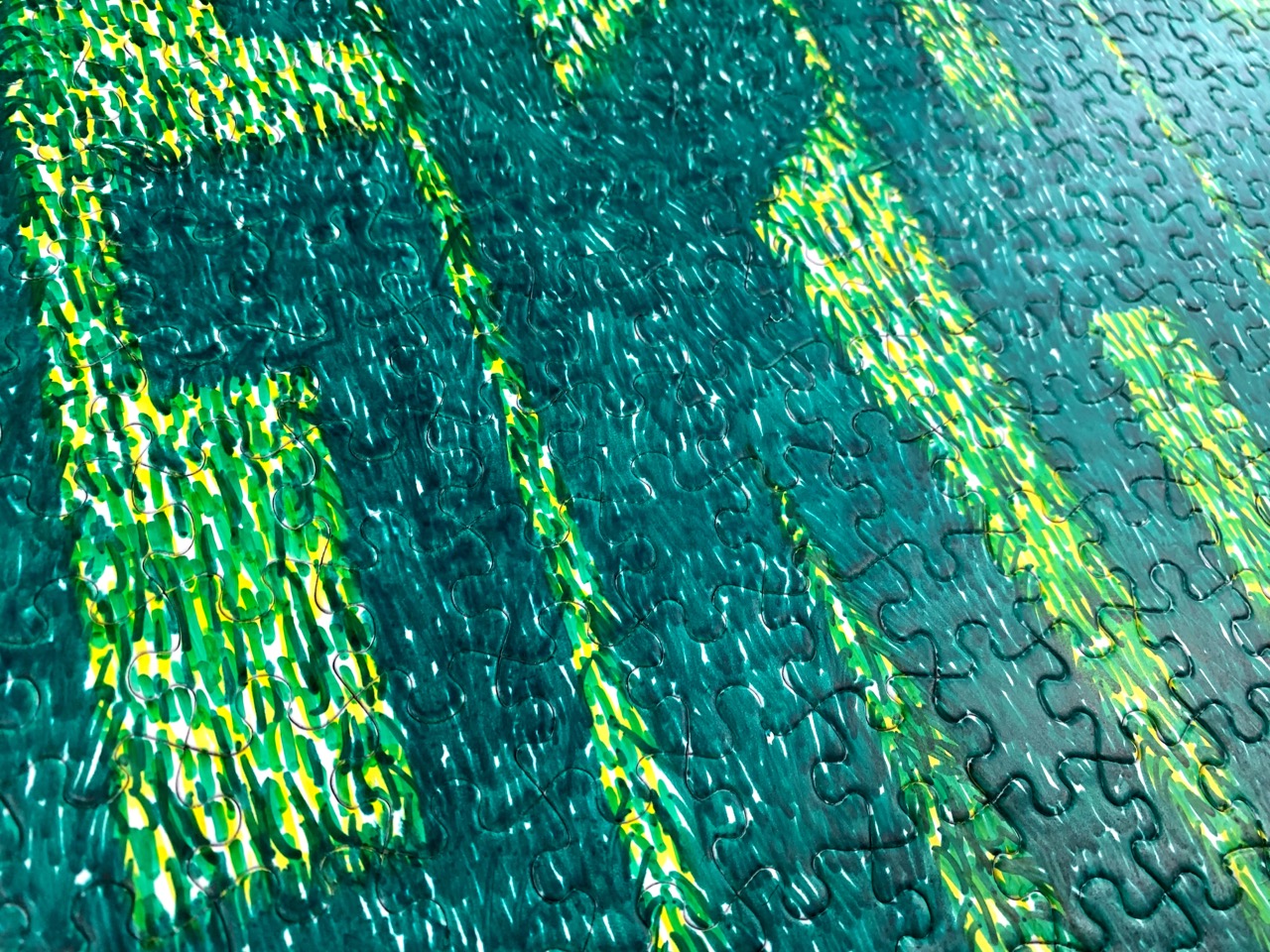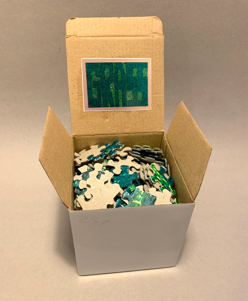 Puzzle Tout Nouveau are one-of-a-kind paintings executed on salvaged and reassembled puzzles. Puzzles are acquired second hand and assembled. An original painting is rendered on the completed puzzle using a variety of techniques such as silkscreen, spray paint, stenciling, as well as hand-drawn elements. Finally, the puzzle is disassembled, and re-packaged. The number of pieces is screen-printed on the box and each box includes a reference photo so you can put it back together. Boxes vary in size and shape, as does the price. Each puzzle is unique.