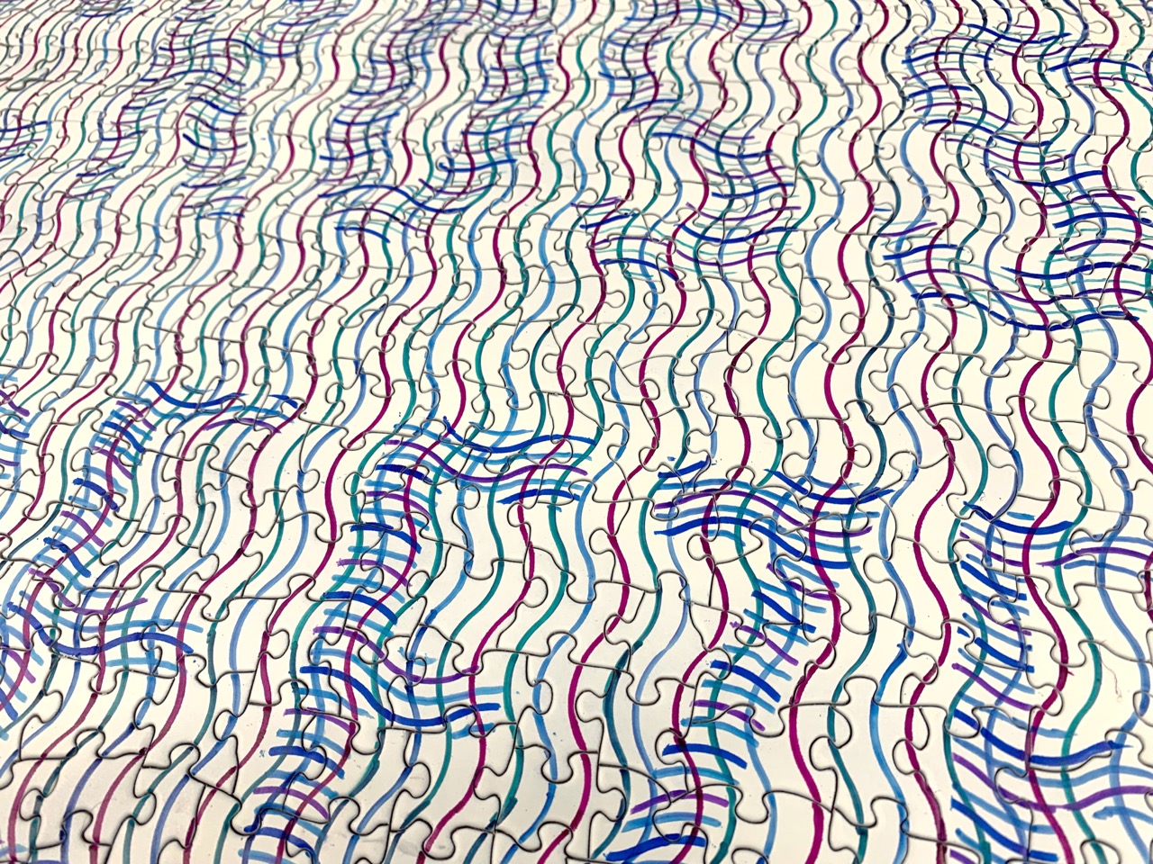Puzzle Tout Nouveau are one-of-a-kind paintings executed on salvaged and reassembled puzzles. Puzzles are acquired second hand and assembled. An original painting is rendered on the completed puzzle using a variety of techniques such as silkscreen, spray paint, stenciling, as well as hand-drawn elements. Finally, the puzzle is disassembled, and re-packaged. The number of pieces is screen-printed on the box and each box includes a reference photo so you can put it back together. Boxes vary in size and shape, as does the price. Each puzzle is unique.