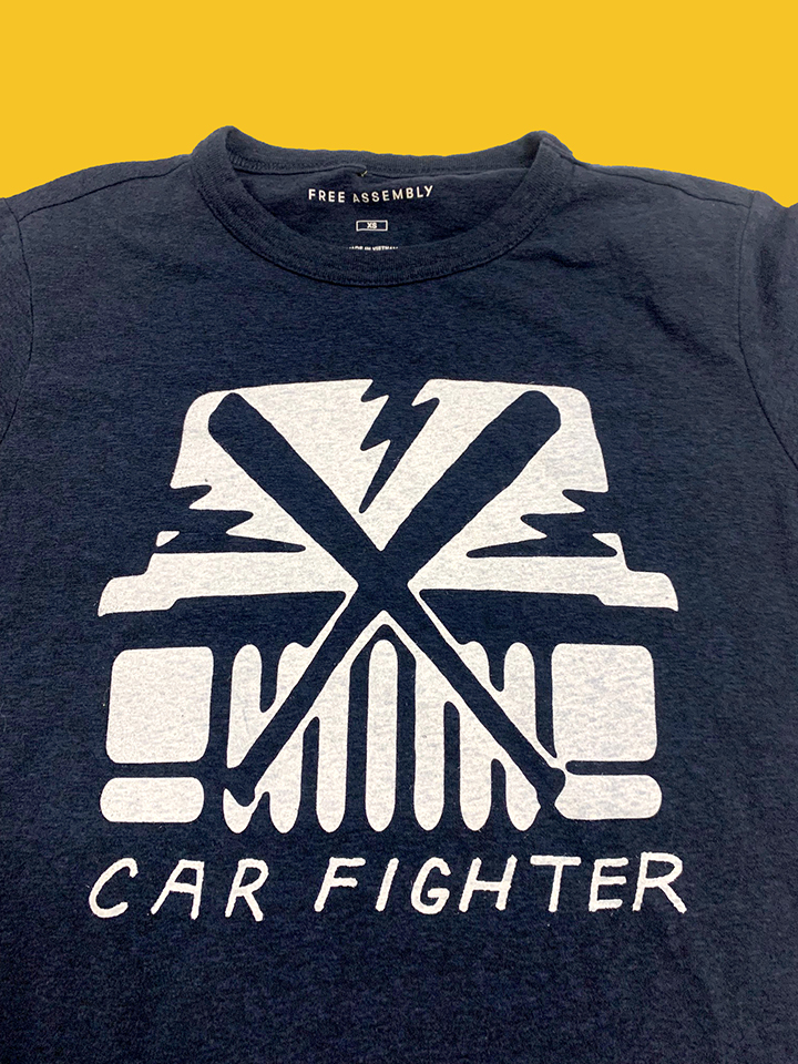 Bring out the Car Fighter within! Carfighter Logo printed in white on Heather Navy Blue thrifted tee. Size: XS Each shirt is unique.