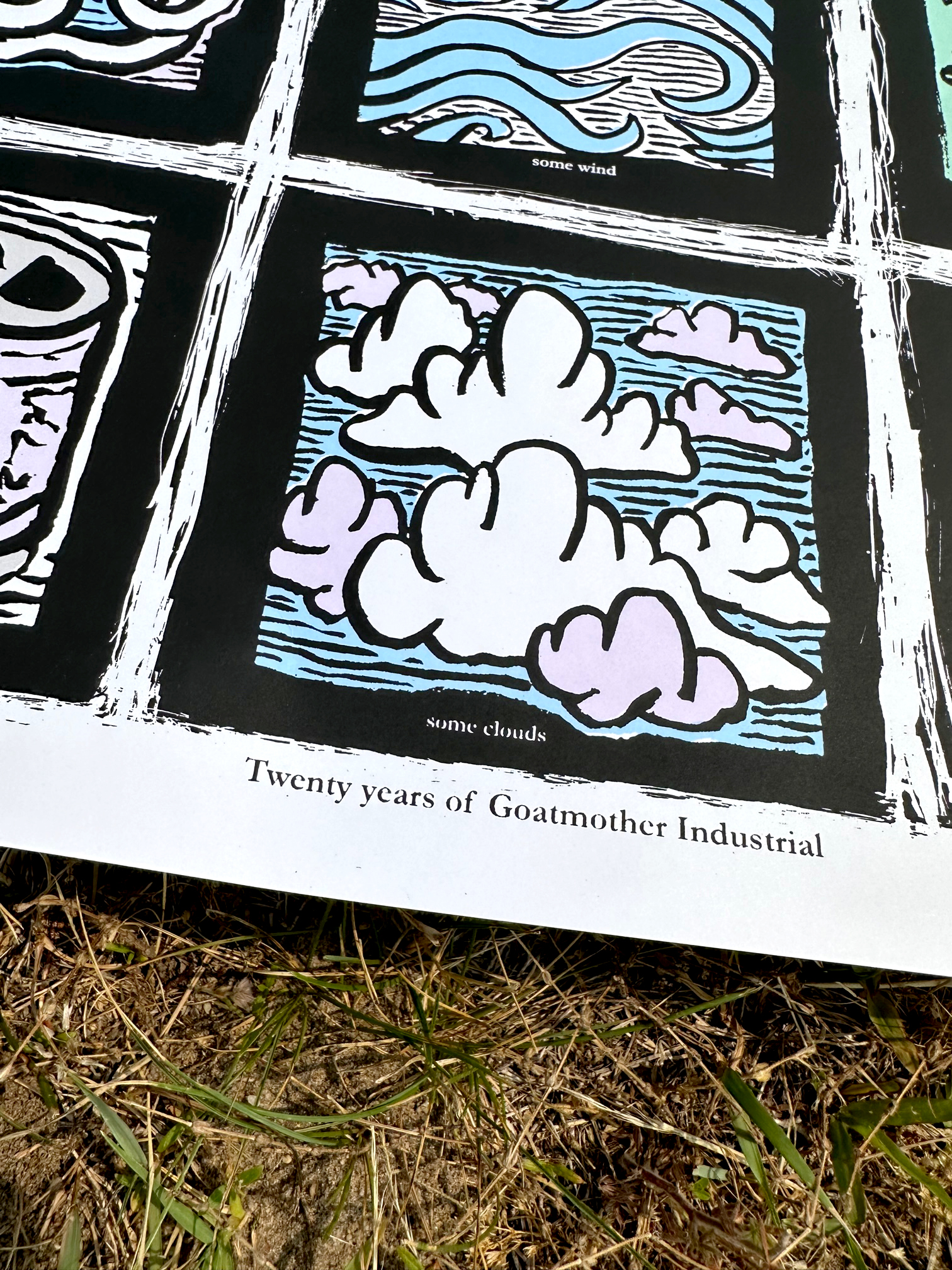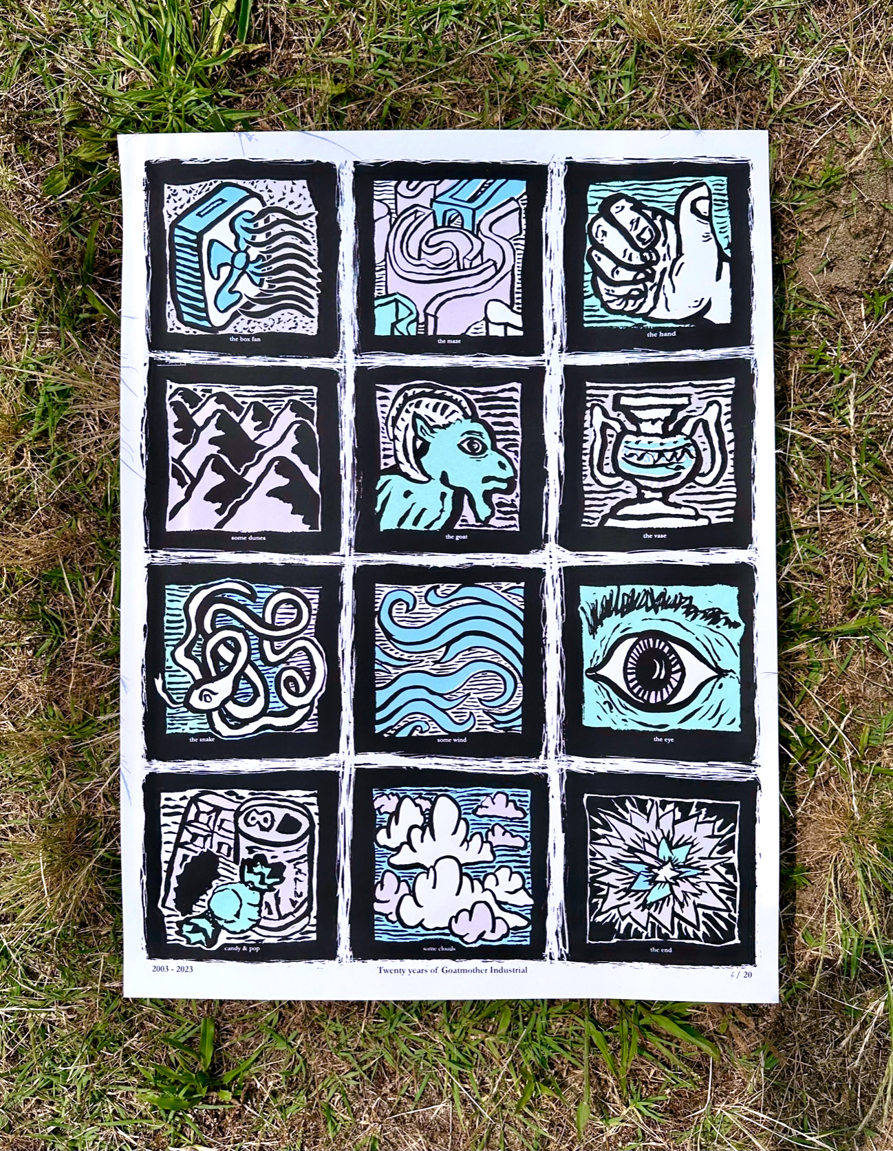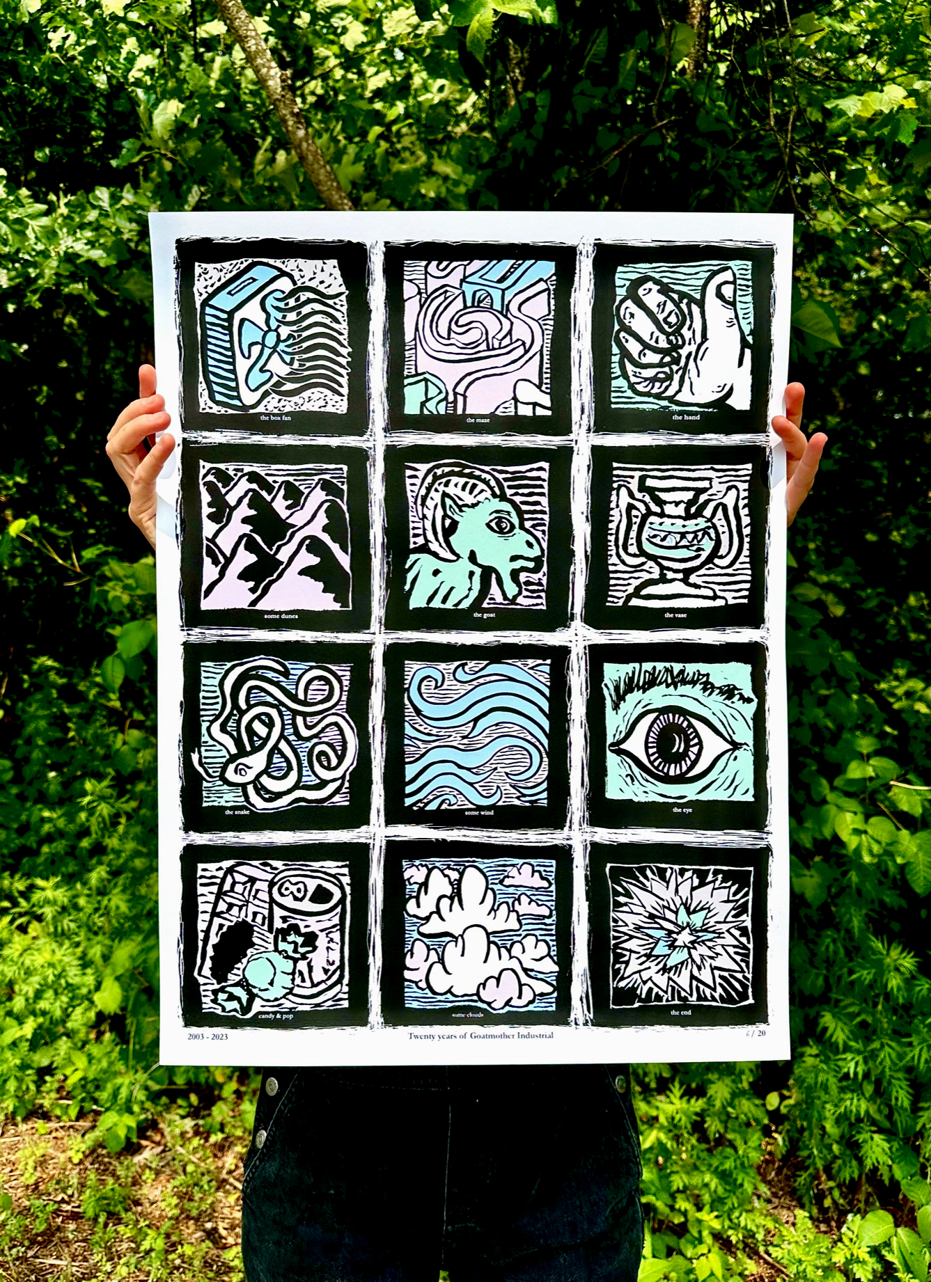 Goatmother Industrial was established in June of 2003. I was coming from art-skool but also band culture, and an over-arching nom de plume seemed the best way to offer myself the freedom to make whatever I wanted, while offering a phony corporate skeleton, and a slight tongue/cheek remark in the direction of the "Business of Being Creative." And of course, it offered a (thinly-veiled) anonymity and a padded landing against any possible sullying of the concise yet lackluster name given to me by my parents :)